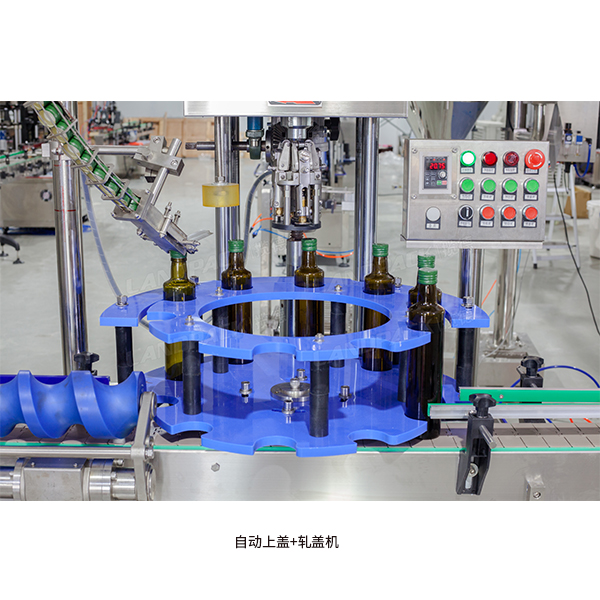 該自動(dòng)灌裝生產(chǎn)線主要用于流動(dòng)性好的液體,其黏度范圍在1-100cp內(nèi),可用于食品、醫(yī)藥等行業(yè),如食用油,口服液,紅酒等等。該生產(chǎn)線使用的封口機(jī)為扎蓋機(jī),瓶子與蓋子一對一現(xiàn)配螺紋,使封口效果更好,密封性更強(qiáng);人工套膠帽后配收縮機(jī),使膠帽貼實(shí)光滑,美觀無皺;最后進(jìn)行貼標(biāo)。該機(jī)具有適用廣泛、自動(dòng)化程度高、灌裝精度高、生產(chǎn)效率高、操作簡單、使用壽命長等特點(diǎn)。