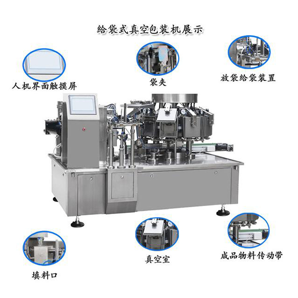 給袋式真空包裝機(jī)代替了手工包裝,操作人員只要將做好的一個(gè)一個(gè)的袋子,一次性將幾百個(gè)袋子放在設(shè)備的取袋部,設(shè)備機(jī)械手會(huì)自動(dòng)的取袋、打印日期、開袋、給計(jì)量裝置信號(hào)計(jì)量并落料、封口、輸出。